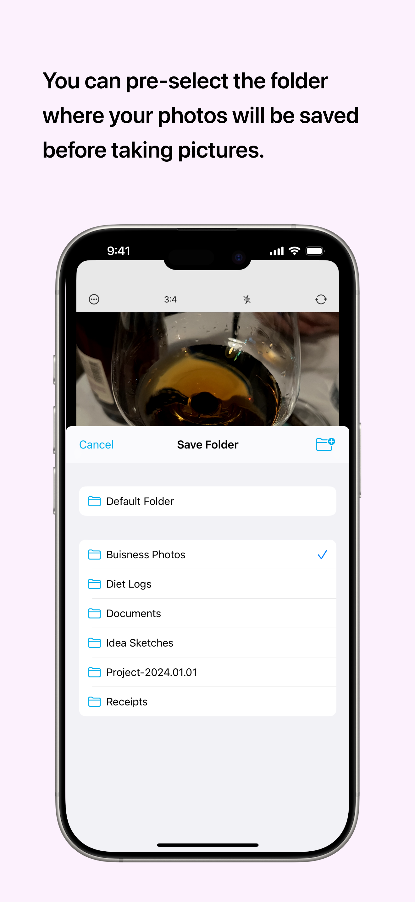 Capture photos and automatically save to the pre-selected folder.