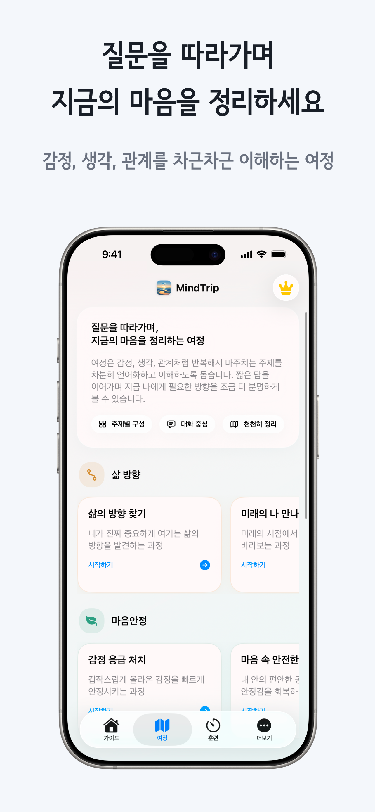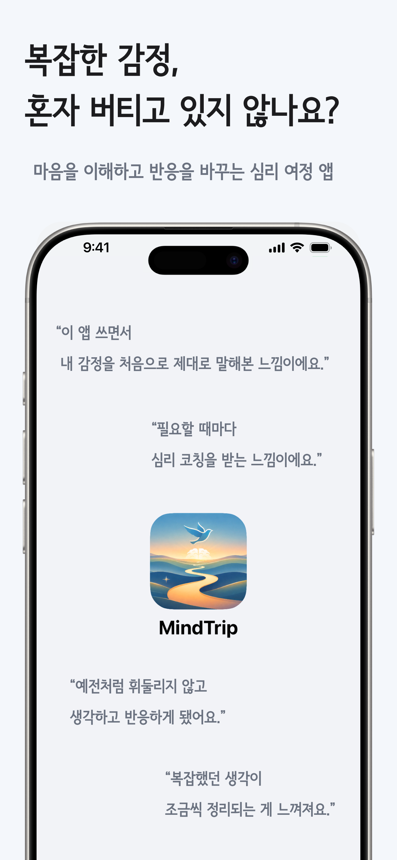MindTrip은 대화와 심리 스킬 훈련으로 당신의 마음을 함께 정리합니다.